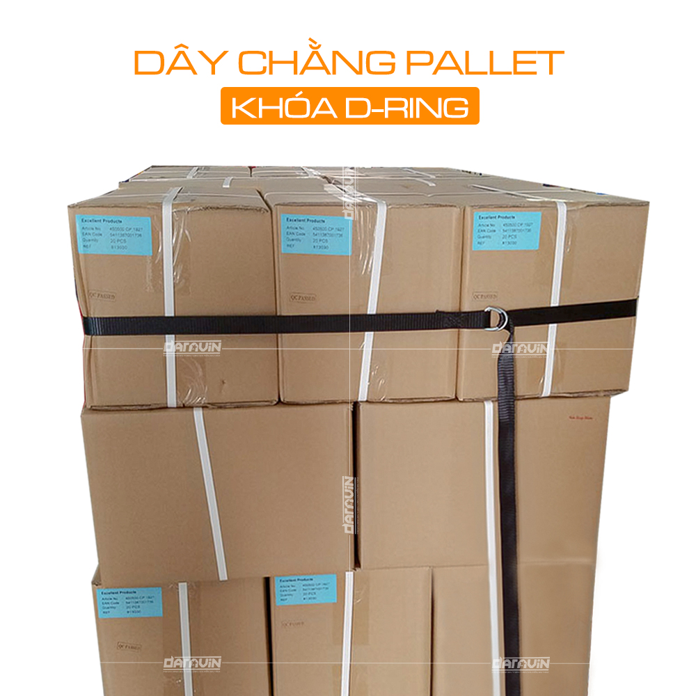 Dây ràng pallet khóa ring xiết bản 38x5m cam được dùng để cố định những hàng hóa dễ vỡ