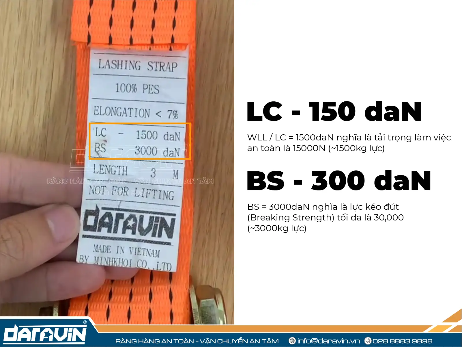 BS (Breaking Strength - Tải trọng Phá vỡ): Là thông số cho biết giới hạn phá hủy của sản phẩm, chỉ dùng cho mục đích kỹ thuật và so sánh, tuyệt đối không được dùng làm tải trọng chằng buộc.