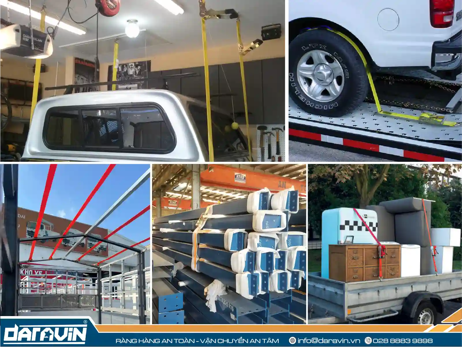 Phân tích tình huống: Đây là loại hàng phổ biến nhất, thường được vận chuyển trên xe tải có các điểm neo cố định như vòng D-ring hoặc các thanh kim loại chắc chắn. Yêu cầu là một liên kết ổn định, chống trượt.