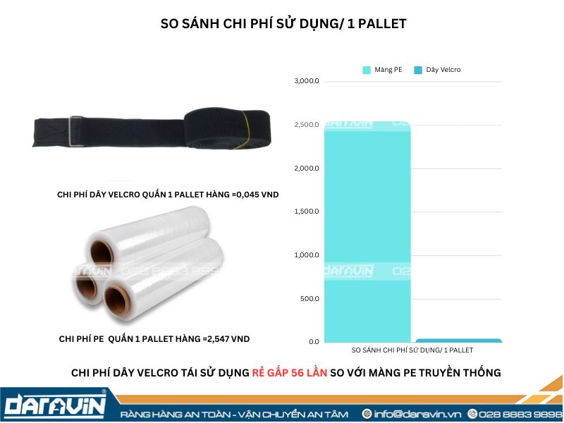 - Chi phí vật liệu: Dây Velcro có thể sử dụng lại nhiều lần (cụ thể là từ 1.000 - 2.000 lần), trong khi màng quấn PE chỉ có thể dùng 1 lần. Chi phí màng PE khi sử dụng lên hàng hoá và không thể tái chế đắt gấp 56 lần so với chi phí dây Velcro. Điều này giúp doanh nghiệp tiết kiệm chi phí vật liệu đáng kể.