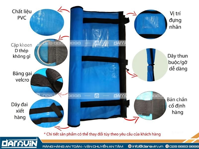 Dây đai xiết hàng: Dây đai được làm từ 100% Polyester, thiết kế đơn giản, dễ bảo dưỡng hoặc thay thế khi bị hư hỏng. Dây đai có độ bền tốt, dễ giặt ủi và có tuổi thọ từ 2-3 năm, giúp tiết kiệm chi phí.