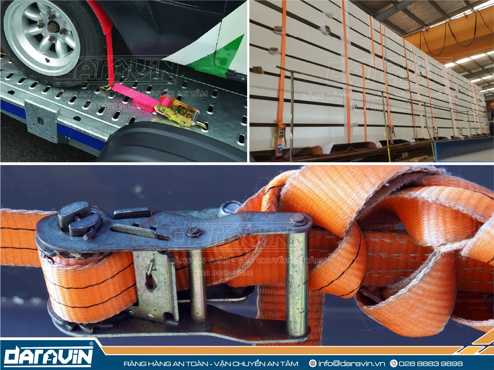 Ứng dụng: Vận tải hàng hóa bằng đường bộ (xe tải, container), đường biển (tàu chở hàng), đường sắt và trong kho bãi để cố định hàng hóa trên pallet hoặc trong quá trình lưu trữ.