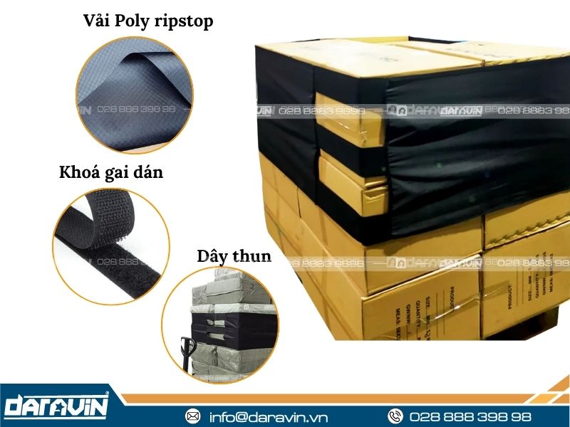 Vải quấn: Được làm từ vải canvas hoặc PE Tarpaulin chống thấm nước, chống bụi bẩn và chống ánh sáng (tia UV) tuyệt đối.