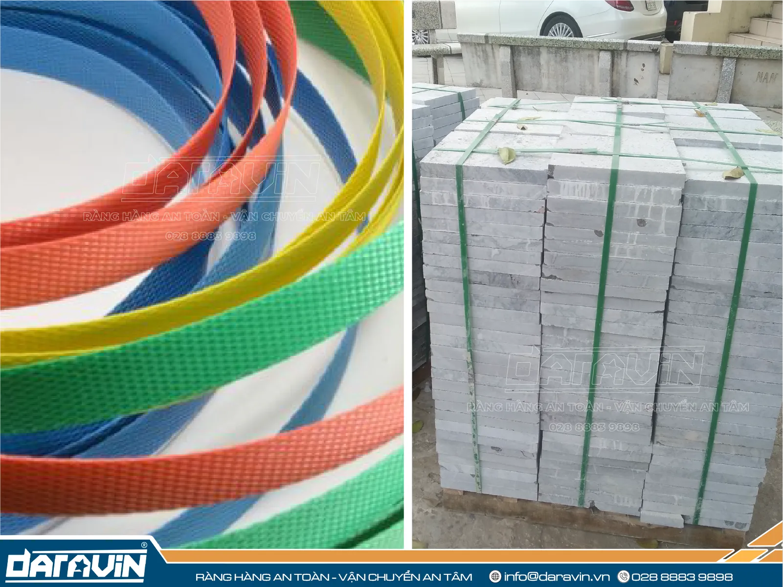 An toàn hơn dây đai thép: Không gây rỉ sét, ít nguy hiểm cho người sử dụng và hàng hóa hơn khi bị đứt.